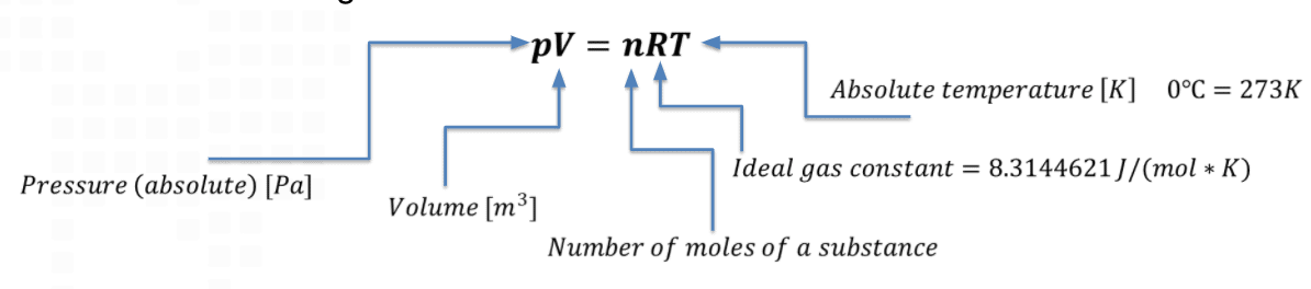 Table with explanations for the ideal gas law